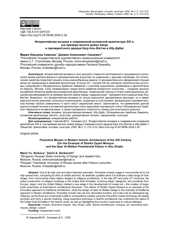 Флорентийская мозаика в силу высокой стоимости изготовления и трудоемкости исполнения менее распространена в монументальном искусстве по сравнению с другими техниками. Ее эстетические свойства позволяют решать очень разнообразные задачи: от монументального оформления станций метро до применения в храмовой архитектуре. В конце ХХ – начале ХХI вв. активное строительство культовых сооружений в Объединенных Арабских Эмиратах с участием художников, дизайнеров и архитекторов из Европы, Японии, США ознаменовало новый виток развития мозаичного искусства – создание крупных ансамблей объектов арабо-мусульманской архитектуры. Новаторский подход в плане композиционных решений рассматривается на примере мечети шейха Заеда, традиционный – президентского дворца Каср Аль-Ваттан. Выявлено, что флорентийская мозаика не только выполняет декоративную функцию, но и имеет идеологическое значение, поскольку в композициях, созданных в этой технике, флоральные и орнаментальные мотивы глубоко символичны и часто несут сакральный смысл. Заключается, что применение данной дорогостоящей техники в исламской архитектуре стало средством подчеркнуть статус Объединенных Арабских Эмиратов в исламском мире, а также подчеркнуть открытость страны для культурного диалога.