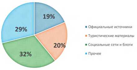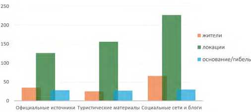 Рис. 2 дает представление о распределении сюжетов в разных интер-нет-источниках. Из него следует, что преобладают сюжеты, связанные с локациями города (так как они абсолютно лидируют в общей выборке сюжетов). Однако если официальные источники и туристические материалы используют другие сюжеты (связанные с жителями и легендами об основании и гибели города) в своей выборке довольно однородно, то в соци- альных сетях намечается незначительное увеличение сюжетов, связанных с городскими жителями.