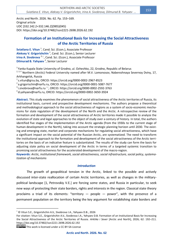 Formation of an Institutional Basis for Increasing the Social Attractiveness of the Arctic Territories of Russia
