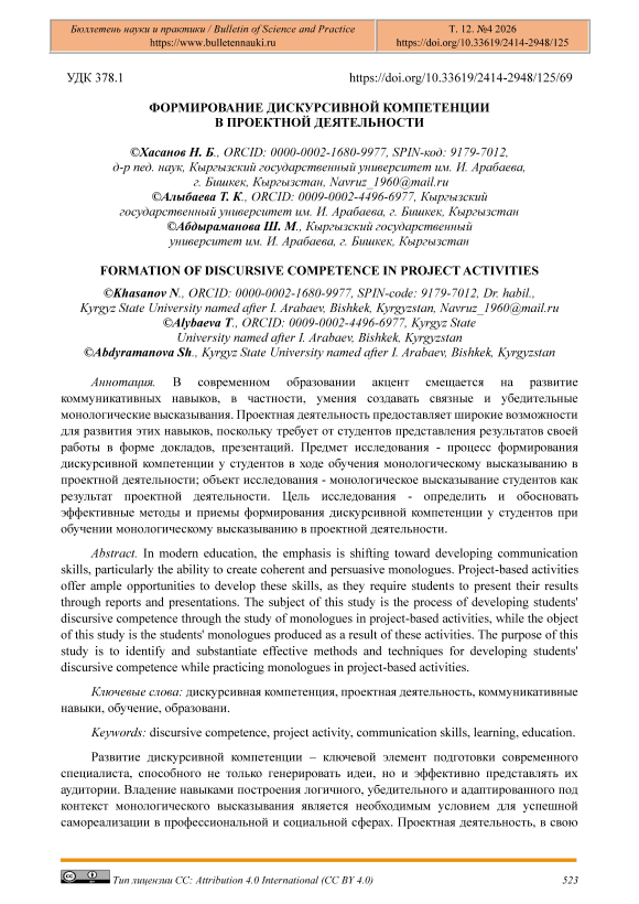 В современном образовании акцент смещается на развитие коммуникативных навыков, в частности, умения создавать связные и убедительные монологические высказывания. Проектная деятельность предоставляет широкие возможности для развития этих навыков, поскольку требует от студентов представления результатов своей работы в форме докладов, презентаций. Предмет исследования - процесс формирования дискурсивной компетенции у студентов в ходе обучения монологическому высказыванию в проектной деятельности; объект исследования - монологическое высказывание студентов как результат проектной деятельности. Цель исследования - определить и обосновать эффективные методы и приемы формирования дискурсивной компетенции у студентов при обучении монологическому высказыванию в проектной деятельности.