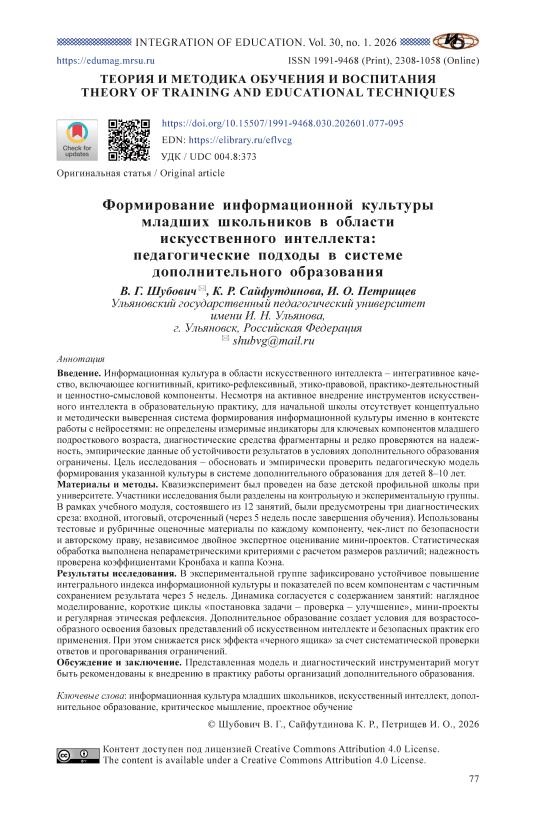 Введение. Информационная культура в области искусственного интеллекта – интегративное качество, включающее когнитивный, критико-рефлексивный, этико-правовой, практико-деятельностный и ценностно-смысловой компоненты. Несмотря на активное внедрение инструментов искусственного интеллекта в образовательную практику, для начальной школы отсутствует концептуально и методически выверенная система формирования информационной культуры именно в контексте работы с нейросетями: не определены измеримые индикаторы для ключевых компонентов младшего подросткового возраста, диагностические средства фрагментарны и редко проверяются на надежность, эмпирические данные об устойчивости результатов в условиях дополнительного образования ограничены. Цель исследования – обосновать и эмпирически проверить педагогическую модель формирования указанной культуры в системе дополнительного образования для детей 8–10 лет. Материалы и методы. Квазиэксперимент был проведен на базе детской профильной школы при университете. Участники исследования были разделены на контрольную и экспериментальную группы. В рамках учебного модуля, состоявшего из 12 занятий, были предусмотрены три диагностических среза: входной, итоговый, отсроченный (через 5 недель после завершения обучения). Использованы тестовые и рубричные оценочные материалы по каждому компоненту, чек-лист по безопасности и авторскому праву, независимое двойное экспертное оценивание мини-проектов. Статистическая обработка выполнена непараметрическими критериями с расчетом размеров различий; надежность проверена коэффициентами Кронбаха и каппа Коэна. Результаты исследования. В экспериментальной группе зафиксировано устойчивое повышение интегрального индекса информационной культуры и показателей по всем компонентам с частичным сохранением результата через 5 недель. Динамика согласуется с содержанием занятий: наглядное моделирование, короткие циклы «постановка задачи – проверка – улучшение», мини-проекты и регулярная этическая рефлексия. Дополнительное образование создает условия для возрастосообразного освоения базовых представлений об искусственном интеллекте и безопасных практик его применения. При этом снижается риск эффекта «черного ящика» за счет систематической проверки ответов и проговаривания ограничений. Обсуждение и заключение. Представленная модель и диагностический инструментарий могут быть рекомендованы к внедрению в практику работы организаций дополнительного образования.