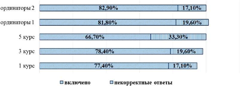 Онлайн участие позволило собрать большой массив данных, однако некоторые анкеты пришлось исключить из-за дефектов заполнения. После фильтрации неполноценных и некорректно заполненных анкет остались результаты 582 респондентов, представляющих пять категорий: студенты 1-го, 3-го и 5-го курсов, а также ординаторы 1-го и 2-го годов обучения.