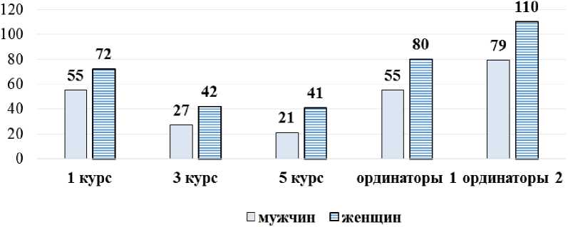 - ординаторов 1-го года – 168, 33 (19,6 %) исключены из исследования;