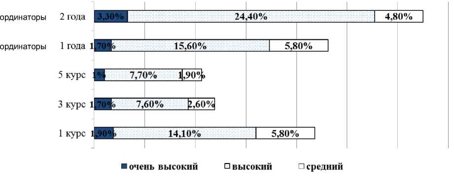 Анализируя уровень эмпатии в исследуемых группах, установлено следующее распределение. Наибольшее число участников с высоким уровнем эмпатии зафиксировано среди студентов 1-го курса, ординаторов 1-го и 2-го года обучения. Максимальное количество респондентов с очень высоким уровнем эмпатии при- ходится на группу ординаторов 2-го года обучения (рис. 3).