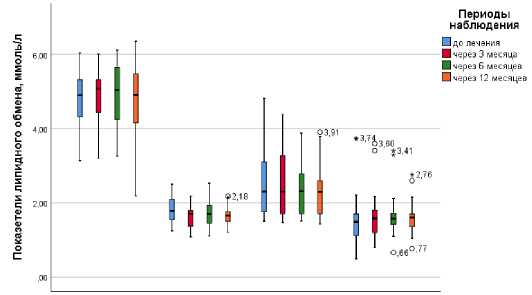(1,72;2,58), p=0,003), в то же время значения вышеописанных параметров находились в пределах референтных. Анализ остальных показателей липидного профиля статистически значимых различий не выявил. Динамика показателей липидного обмена подробно представлены на рисунке 1.