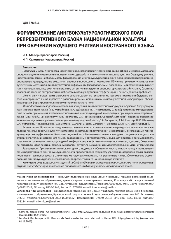 Проблема и цель. Лингвострановедческие и лингвопрагматические принципы отбора учебного материала, определяющие инновационные приемы и методы работы с иноязычным текстом, диктуют будущему учителю иностранного языка необходимость формирования лингвокультурологического поля, репрезентирующего национальную культуру, что не всегда учитывается в процессе его подготовки. Обучение приемам использования аутентичных источников лингвокультурной информации (фразеологизмы, пословицы, идиомы; безэквивалентная и фоновая лексика; эмотивные реалии; аутентичные аудио- и видеоматериалы; онлайн-статьи, блоги) позволяет, по мнению авторов статьи, избежать лингвокультурной интерференции и решить данную проблему. Цель статьи – представить авторские рекомендации по применению приемов подготовки будущего учителя иностранного языка к работе с разножанровыми источниками лингвокультурной информации, обеспечивающими формирование лингвокультурологического поля. Методологию исследования составляют концепция лингвокультурного подхода к обучению будущего учителя иностранного языка (Т.В. Михайлова, К.К. Дуйсекова, В.П. Фурманова, C. Yang); теоретико-методологические основы применения аутентичных источников лингвокультурной информации при изучении иностранного языка (О.М. Акай, Л.В. Великолуг, А.В. Горелкина, С.Г. Тер-Минасова, Contens1, LernRudi2); практико-ориентированные исследования, рассматривающие лингвокультурный текст (Д.А. Бастриков, А.М. Клестер, Н.Ю. Шнякина, С.А. Жилякова, Н.Н. Кондакова, Е.И. Зимина, L. Zhang, C. Yang, V. Popov, H. Biemans, J. Liu, T.-A. Screfsrud и др.). Результаты. В рамках исследования уточнена сущность понятия «лингвокультурологическое поле», выявлены приемы работы с аутентичными источниками лингвокультурной информации, снимающими лингво-культурную интерференцию. Комплекс заданий по обеспечению лингвокультурного подхода к подготовке будущих учителей иностранного языка, разработанный авторами статьи, включает описание приемов работы с такими источниками лингвокультурной информации, как фразеологизмы, пословицы, идиомы; безэквивалентная и фоновая лексика; эмотивные реалии; аутентичные аудио- и видеоматериалы; онлайн-статьи, блоги. Заключение. Применение лингвокультурного подхода к обучению иностранному языку с привлечением информативного лингвокультурного текста предоставляет будущему учителю иностраного языка возможность научиться использовать различные методические приемы, направленные на выработку навыка формирования лингвокультурологического поля, репрезентующего национальную культуру.