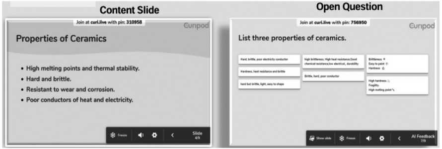 Рис. 1. Слайд-контент и слайд с открытым вопросом интерактивной платформы Curipod в процессе изучения свойств керамики