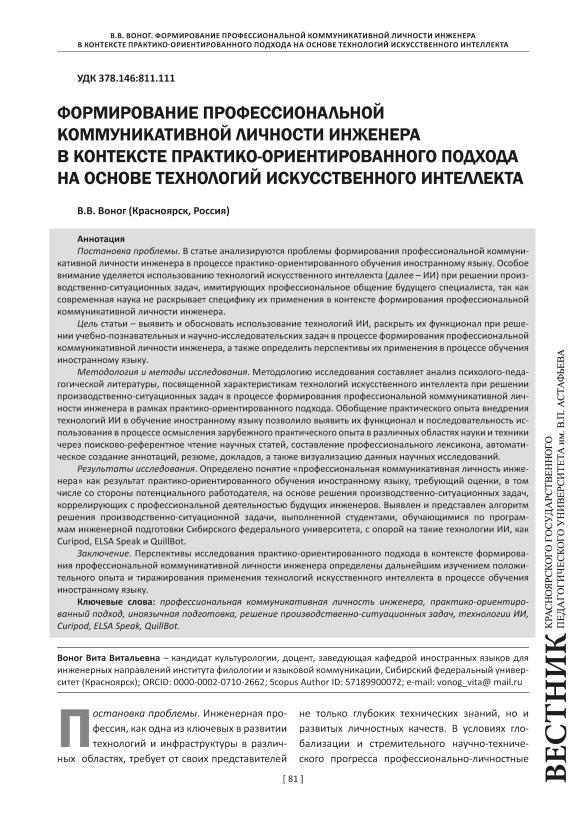 Профессиональная коммуникативная личность инженера, практико-ориентированный подход, иноязычная подготовка, решение производственно-ситуационных задач, технологии ИИ, Curipod, ELSA Speak, QuillBot