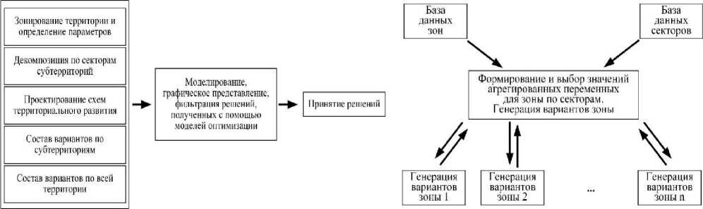 Задача функционального зонирования территории с учётом размещения ЭУ включена в стратегию территориального развития (ТР), которая направлена на формирование промышленной, сельскохозяйственной и сервисной отраслей [14], включая сети дорог, водоснабжения, связи, энергоснабжения, водораспределения и т.п. для каждого из районов, составляющих территорию, а также с учётом потребностей близлежащих территорий. На рисунке 1 представлен набор компонентов системы ТР. ТР касается всех секторов экономики и должно корректироваться в каждом временном разрезе (годовом, квартальном, ежемесячном и оперативном), а также при декомпозиции по функциям производственной деятельности [15]. Схема согласования секторов происходит для каждой зоны, как показано на рисунке 2.