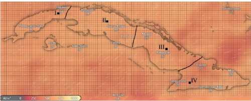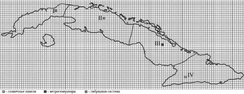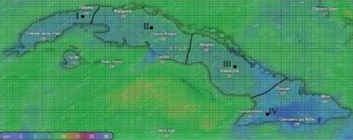 Электроэнергетическая система представляет собой комбинацию подсистем теплоэлектростанций и ВИЭ. Периодически возникает необходимость восполнения дефицита электроэнергии путём использования ВИЭ. Перебором вариантов формируется оптимальное решение по использованию в подсистеме ВИЭ того или иного вида ВИЭ или её гибридного варианта. Гибридные подсистемы, хотя и обеспечивают более стабильное энергоснабжение, требуют больших начальных инвестиций и более сложного технического обслуживания. Выбор между СП, ВГ или гибридной системой зависит от ряда факторов. Куба расположена в тропическом климатическом поясе, где высокий уровень солнечного излучения сохраняется в течение всего года, что обусловливает выбор в пользу СП как эффективного источника энергии. При этом остров подвержен пассатным ветрам, что создаёт хорошие условия для использования ВГ. Распределение ветровых ресурсов может быть неравномерным по территории острова. Территория Республики Куба условно поделена на четыре зоны (рисунок 3). Для анализа территории с целью выбора наиболее подходящего ВИЭ используется пространственно-временная сетка с разрешением 10^10 км, временной шаг - 3 часа.
