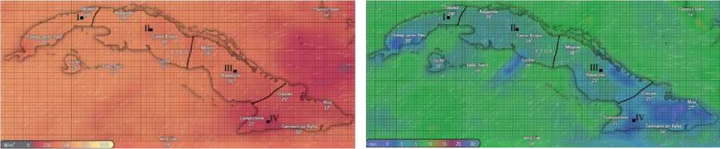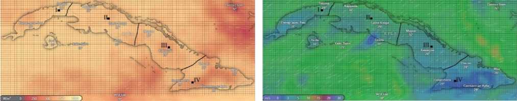 Рисунок 4 – Отображение распределения интенсивно- Рисунок 5 – Отображение распределения скорости сти солнечного излучения и температуры окружающе- ветра и температуры окружающего воздуха на терриго воздуха на территории Кубы с интервалом времени тории Кубы с интервалом времени 3 часа
