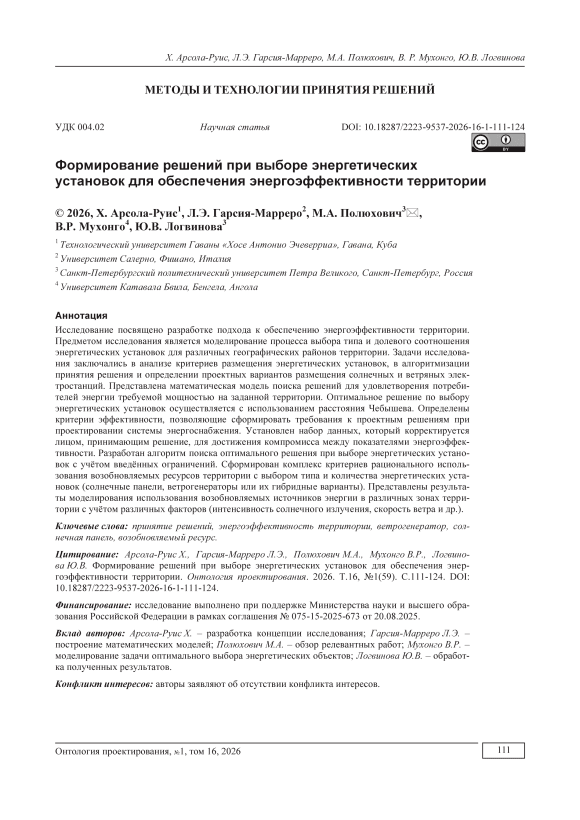 Исследование посвящено разработке подхода к обеспечению энергоэффективности территории. Предметом исследования является моделирование процесса выбора типа и долевого соотношения энергетических установок для различных географических районов территории. Задачи исследования заключались в анализе критериев размещения энергетических установок, в алгоритмизации принятия решения и определении проектных вариантов размещения солнечных и ветряных электростанций. Представлена математическая модель поиска решений для удовлетворения потребителей энергии требуемой мощностью на заданной территории. Оптимальное решение по выбору энергетических установок осуществляется с использованием расстояния Чебышева. Определены критерии эффективности, позволяющие сформировать требования к проектным решениям при проектировании системы энергоснабжения. Установлен набор данных, который корректируется лицом, принимающим решение, для достижения компромисса между показателями энергоэффективности. Разработан алгоритм поиска оптимального решения при выборе энергетических установок с учѐтом введѐнных ограничений. Сформирован комплекс критериев рационального использования возобновляемых ресурсов территории с выбором типа и количества энергетических установок (солнечные панели, ветрогенераторы или их гибридные варианты). Представлены результаты моделирования использования возобновляемых источников энергии в различных зонах территории с учѐтом различных факторов (интенсивность солнечного излучения, скорость ветра и др.).