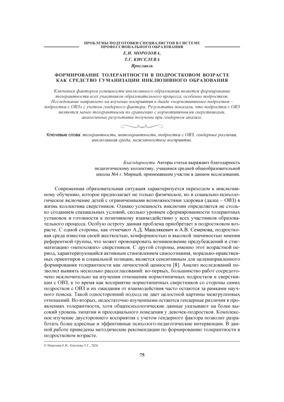 Толерантность, интолерантность, подростки с ОВЗ, гендерные различия, инклюзивная среда, межличностное восприятие