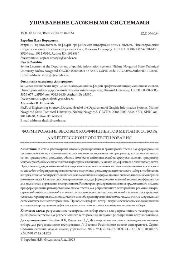 В статье рассмотрены способы ранжирования и группировки тестов для формирования тестовых наборов при проведении регрессионного тестирования: по приоритету, длительности выполнения, предыдущему результату, общему количеству найденных ошибок, сроку выполнения, приоритету микросервиса, объему внесенных в микросервис изменений, наличию модификаций в смежных сервисах. Предложен подход, позволяющий формировать актуальные значения весовых коэффициентов для каждого из способов отбора и ранжирования тестов с получением результирующего тестового набора, чтобы тесты, которые позволят обнаружить наиболее важные ошибки в информационной системе, находились в верхней половине списка. Описаны способы применения подхода формирования значений весовых коэффициентов для двух систем управления тестированием. Рассмотрен пример использования предложенного подхода при формировании ранжированного списка тестов для регрессионного тестирования реальной микросервисной информационной системы с использованием автоматизированной системы ранжирования тестов, которая произвольное количество способов ранжирования позволяет подключить к современным системам управления тестированием. Приведены графики потери актуальности весовых коэффициентов и появления пропущенных дефектов в зависимости от полноты выполнения тестового набора.