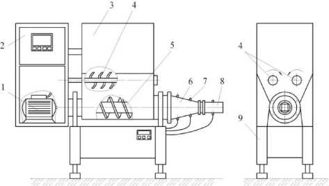 Figure 1. Bouwpaco ВРЕХ4500 molding machine: 1-drive; 2 – control panel; 3 – receiving hopper; 4 – tedders; 5 – auger; 6 – forming channel; 7 – pressure sensor; 8 – mouthpiece, 9 – frame