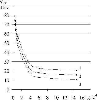 Рисунок 3. Зависимость эффективной вязкости дрожжей п эФ от скорости сдвига у при различной влажности W ,%: 1 – 68; 2 – 70; 3 – 72. t = 10 °C Figure 3. Dependence of the effective viscosity of yeast n ef on the shear rate у at different moisture W ,%: 1 – 68; 2 – 70; 3 – 72. t = 10 °C