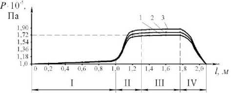 Figure 5. The change in pressure along the length of the working chamber at various temperatures: 1 - 5 ° С, 2 - 10 ° С, 3 - 15 ° С