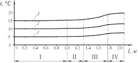 Рисунок 7. Изменение температуры дрожжей по длине рабочей камеры при различных температурах tH : 1 - 5 ° С, 2 - 10 ° С, 3 - 15 ° С.
