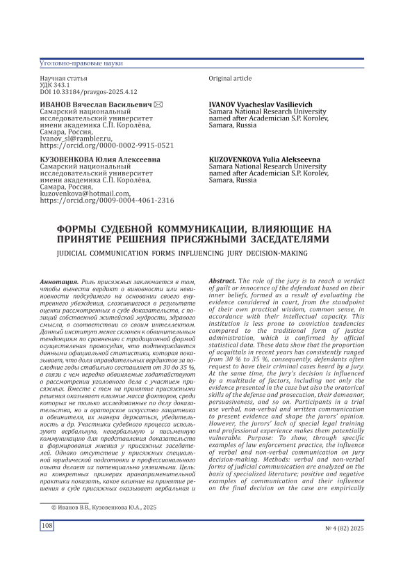 Роль присяжных заключается в том, чтобы вынести вердикт о виновности или невиновности подсудимого на основании своего внутреннего убеждения, сложившегося в результате оценки рассмотренных в суде доказательств, с позиций собственной житейской мудрости, здравого смысла, в соответствии со своим интеллектом. Данный институт менее склонен к обвинительным тенденциям по сравнению с традиционной формой осуществления правосудия, что подтверждается данными официальной статистики, которая показывает, что доля оправдательных вердиктов за последние годы стабильно составляет от 30 до 35 %, в связи с чем нередко обвиняемые ходатайствуют о рассмотрении уголовного дела с участием присяжных. Вместе с тем на принятие присяжными решения оказывает влияние масса факторов, среди которых не только исследованные по делу доказательства, но и ораторское искусство защитника и обвинителя, их манера держаться, убедительность и др. Участники судебного процесса используют вербальную, невербальную и письменную коммуникацию для представления доказательств и формирования мнения у присяжных заседателей. Однако отсутствие у присяжных специальной юридической подготовки и профессионального опыта делает их потенциально уязвимыми. Цель: на конкретных примерах правоприменительной практики показать, какое влияние на принятие решения в суде присяжных оказывает вербальная и невербальная коммуникация. Методы: вербальные и невербальные формы судебной коммуникации анализировались на основе специальной литературы; эмпирическим путем устанавливались позитивные и негативные примеры коммуникации и влияние на итоговое решение по делу; полученные результаты синтезировались в промежуточные и итоговые выводы. Результаты: сделан вывод, что знание и умелое сочетание техник вербальной и невербальной коммуникации при соблюдении нормативных и этических ограничений позволяют стороне в процессе выглядеть более убедительной и повышают шансы на разрешение дела в ее пользу.