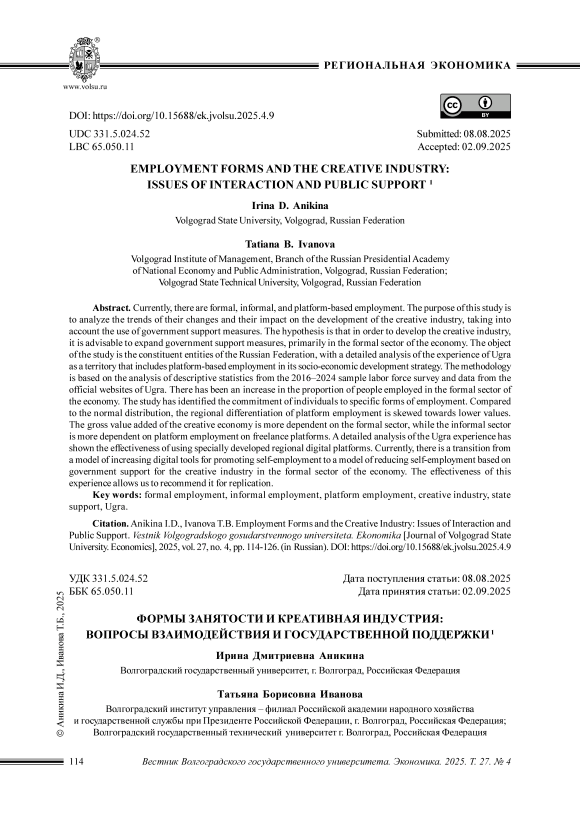 Цель данного исследования – анализ тенденций изменений формальной и неформальной занятости и их влияния на развитие креативной индустрии с учетом применения мер государственной поддержки. Гипотеза: для развития креативной индустрии целесообразно расширять меры государственной поддержки прежде всего в формальном секторе экономики. Объект исследования: субъекты РФ с детализацией анализа опыта Югры как территории, предусматривающей в стратегии социально – экономического развития использование платформенной занятости.