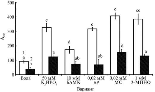 Рис. 1. Накопление супероксида у растений огурца ( Cucumis sativus L.) сорта Феникс в диффуза-тах 1-го листа после его обработки фотосенсибилизаторами и известными индукторами устойчивости: БАМК — в -аминомасляная кислота, МС — метиленовый синий, БР — бенгальский розовый, 2-МПНО — меркаптопиридин-N-оксид; 1 — без СОД (супероксиддисмутаза), 2 — СОД. Средние значения в каждом независимом эксперименте были получены из 6 аналитических повторов и использованы в качестве повторов в статистических тестах ( n = 3) ( M ±SEM, лабораторный опыт, 2019 год).