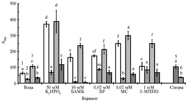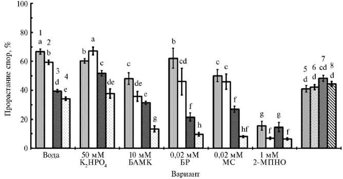 Примечание. БАМК — в -аминомасляная кислота, МС — метиленовый синий, БР — бенгальский розовый, 2-МПНО — меркаптопиридин-К-оксид. Средние значения в каждом независимом эксперименте получены из 4 повторностей по 100 спор и использованы в качестве повторов в статистических тестах ( n = 3). * Различия с контролем (инкубация в темноте) статистически значимы при p < 0,01.