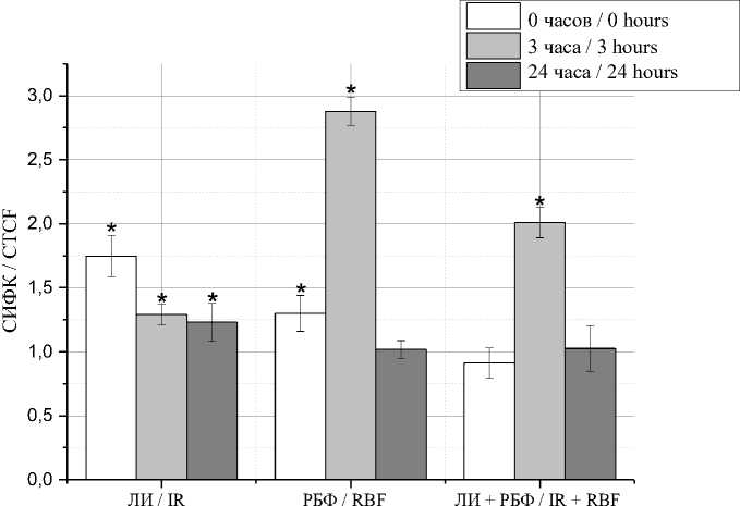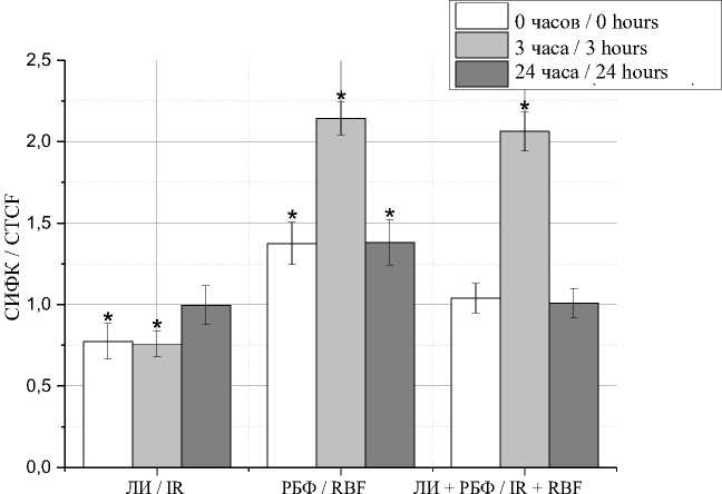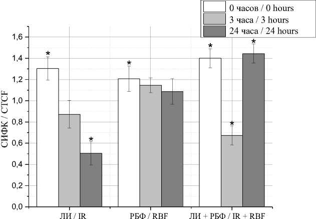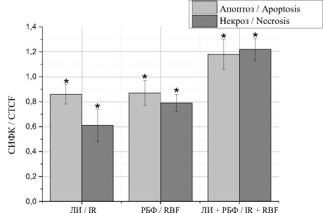 * – статистически достоверное отличие между экспериментом и контролем, p<0,05; ЛИ – лазерное излучение, РБФ – рибофлавин, ЛИ+РБФ – лазерное излучение+ рибофлавин. Далее обозначения те же)