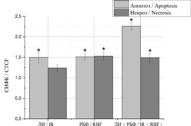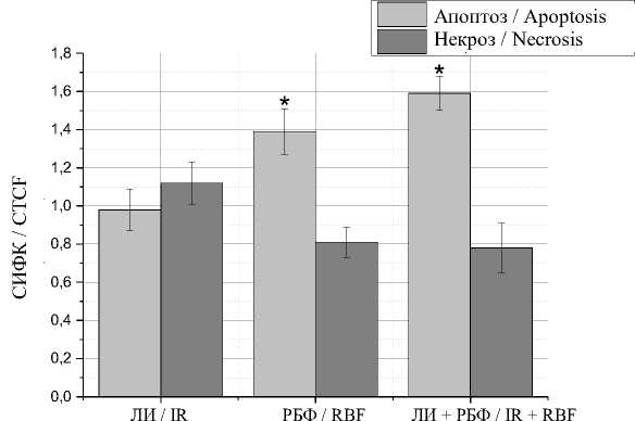 Fig. 1. Levels of apoptosis and necrosis in B16F10 melanoma cells immediately after exposure to laser irradiation (Early signs of apoptotic death are designated as “apoptosis”, late stages of cell death, including necrosis, are designated as “necrosis”; data are presented as the ratio of corrected total cell fluorescence (CTCF) to the control; * – the differences between the experimental and control groups are statistically significant (p<0.05); LI – laser radiation, RBF – riboflavin, LI+RBF – laser radiation + riboflavin.