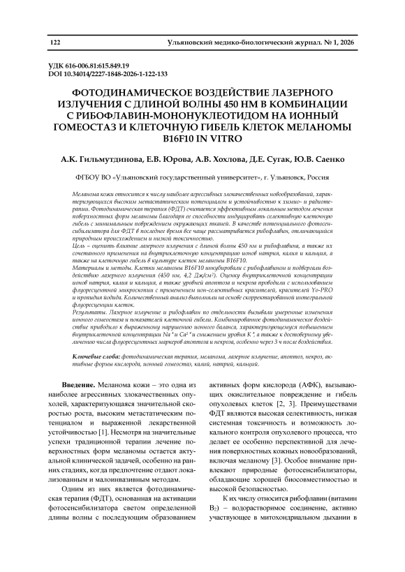 Меланома кожи относится к числу наиболее агрессивных злокачественных новообразований, характеризующихся высоким метастатическим потенциалом и устойчивостью к химиои радиотерапии. Фотодинамическая терапия (ФДТ) считается эффективным локальным методом лечения поверхностных форм меланомы благодаря ее способности индуцировать селективную клеточную гибель с минимальным повреждением окружающих тканей. В качестве потенциального фотосенсибилизатора для ФДТ в последнее время все чаще рассматривается рибофлавин, отличающийся природным происхождением и низкой токсичностью. Цель – оценить влияние лазерного излучения с длиной волны 450 нм и рибофлавина, а также их сочетанного применения на внутриклеточную концентрацию ионов натрия, калия и кальция, а также на клеточную гибель в культуре клеток меланомы B16F10. Материалы и методы. Клетки меланомы B16F10 инкубировали с рибофлавином и подвергали воздействию лазерного излучения (450 нм, 4,2 Дж/см2). Оценку внутриклеточной концентрации ионов натрия, калия и кальция, а также уровней апоптоза и некроза проводили с использованием флуоресцентной микроскопии с применением ион-селективных красителей, красителей Yo-PRO и пропидия йодида. Количественный анализ выполняли на основе скорректированной интегральной флуоресценции клеток. Результаты. Лазерное излучение и рибофлавин по отдельности вызывали умеренные изменения ионного гомеостаза и показателей клеточной гибели. Комбинированное фотодинамическое воздействие приводило к выраженному нарушению ионного баланса, характеризующемуся повышением внутриклеточной концентрации Na⁺ и Ca²⁺ и снижением уровня K⁺, а также к достоверному увеличению числа флуоресцентных маркеров апоптоза и некроза, особенно через 3 ч после воздействия.