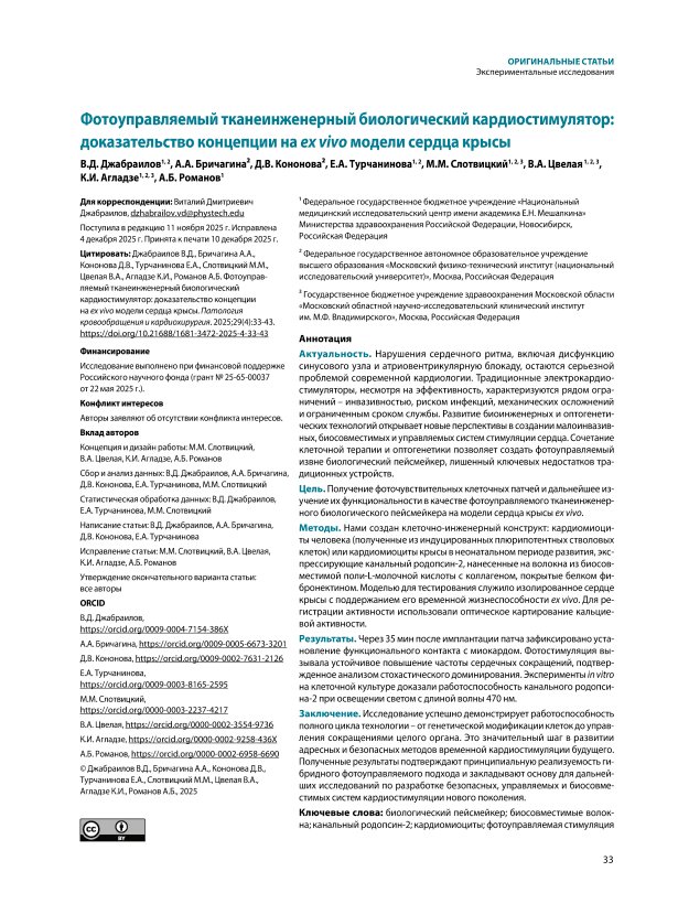 Актуальность. Нарушения сердечного ритма, включая дисфункцию синусового узла и атриовентрикулярную блокаду, остаются серьезной проблемой современной кардиологии. Традиционные электрокардиостимуляторы, несмотря на эффективность, характеризуются рядом ограничений – инвазивностью, риском инфекций, механических осложнений и ограниченным сроком службы. Развитие биоинженерных и оптогенетических технологий открывает новые перспективы в создании малоинвазивных, биосовместимых и управляемых систем стимуляции сердца. Сочетание клеточной терапии и оптогенетики позволяет создать фотоуправляемый извне биологический пейсмейкер, лишенный ключевых недостатков традиционных устройств. Цель. Получение фоточувствительных клеточных патчей и дальнейшее изучение их функциональности в качестве фотоуправляемого тканеинженерного биологического пейсмейкера на модели сердца крысы ex vivo. Методы. Нами создан клеточно-инженерный конструкт: кардиомиоциты человека (полученные из индуцированных плюрипотентных стволовых клеток) или кардиомиоциты крысы в неонатальном периоде развития, экспрессирующие канальный родопсин-2, нанесенные на волокна из биосовместимой поли-L-молочной кислоты с коллагеном, покрытые белком фибронектином. Моделью для тестирования служило изолированное сердце крысы с поддержанием его временной жизнеспособности ex vivo. Для регистрации активности использовали оптическое картирование кальциевой активности. Результаты. Через 35 мин после имплантации патча зафиксировано установление функционального контакта с миокардом. Фотостимуляция вызывала устойчивое повышение частоты сердечных сокращений, подтвержденное анализом стохастического доминирования. Эксперименты in vitro на клеточной культуре доказали работоспособность канального родопсина-2 при освещении светом с длиной волны 470 нм. Заключение. Исследование успешно демонстрирует работоспособность полного цикла технологии – от генетической модификации клеток до управления сокращениями целого органа. Это значительный шаг в развитии адресных и безопасных методов временной кардиостимуляции будущего. Полученные результаты подтверждают принципиальную реализуемость гибридного фотоуправляемого подхода и закладывают основу для дальнейших исследований по разработке безопасных, управляемых и биосовместимых систем кардиостимуляции нового поколения.
