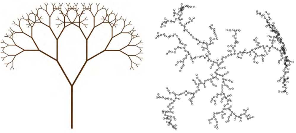 Рис. 1. Фрактальные деревья: ( а ) пример детерминированной реализации; ( б ) пример стохастической реализации