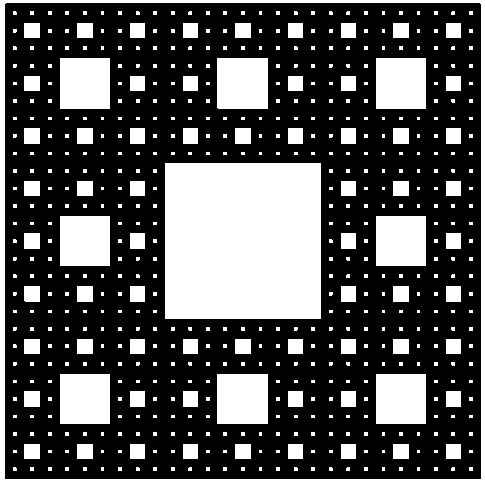 Ковер Серпинского является аналогом треугольника Серпинского, создаваемый рекурсивным удалением центральных квадратов. Обладает регулярной пористой структурой (см. рис. 10).
