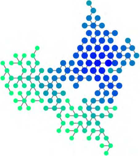 Фрактальные деревья представляют собой самоподобные ветвящиеся графовые структуры, моделирующие природные дендритные системы (нейронные сети, корневые системы растений, речные бассейны, капиллярные сети). Их ключевая особенность – иерархическая организация с повторяющимися шаблонами ветвления на различных масштабах. Отличаются высокой локальной связностью и градиентной плотностью узлов (высокая у корня, снижается к периферии) (см. рис. 1).