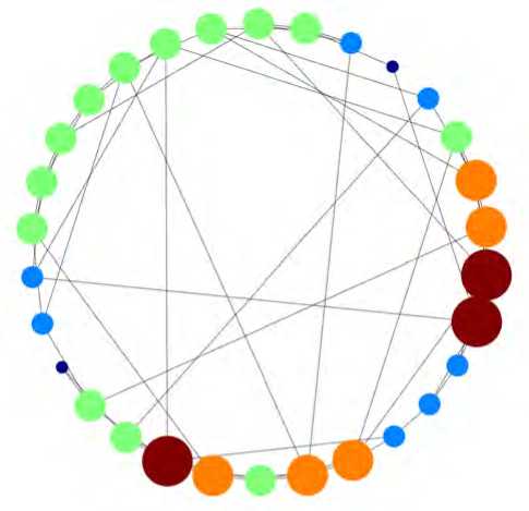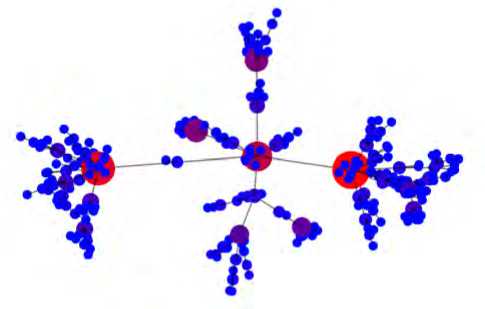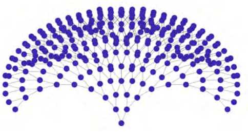 Масштабно–инвариантные сети представляют собой класс графовых топологий, в которых распределение валентностей вершин (связности узлов) подчиняется степенному закону. В подобной сети подавляющее большинство узлов имеют низкую связность, а небольшое число узлов («хабов») обладают экстремально высокой валентностью. При этом в ней отсутствует характерный масштаб связности, т. е. распределение охватывает значе- ния от 1 до kmax ~ N1/(Y-1), где N — число узлов в сети. Такие сети позволяют моделировать структуру глобального Интернета и веб-трафик, архитектуру социальных сетей и транспортную инфраструктуру (см. рис. 3).