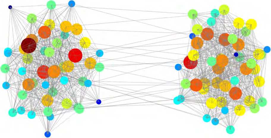 Топология крупномасштабной совокупности нейронных связей мозга (коннектома) демонстрирует свойства сети «малый мир» [26], обеспечивающих баланс связности и компактности внутри локальных модулей (количественно выражаемого высоким коэффициентом кластеризации С ® 0,4 - 0,6), а также быструю коммуникацию между любыми узлами сети, обусловленную малой средней длиной пути Lcp ~ ln N.