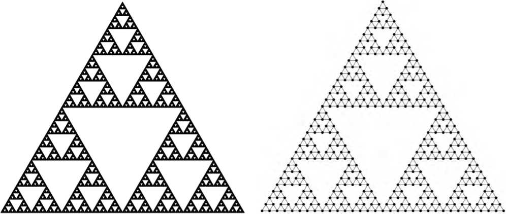 Треугольник Серпинского формируется рекурсивным удалением центральных треугольников. Демонстрирует свойства пористых структур с убывающей плотностью. К числу ключевых особенностей сетевой структуры следует отнести разреженность связей при сохранении глобальной связности.