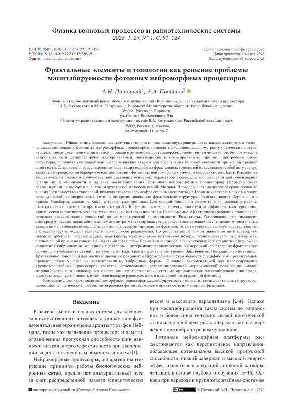 Фотонные нейроморфные процессоры, масштабируемость, топология сети, фрактальные структуры, самоподобие, оптические потери, интегральная фотоника, малая мировая сеть, инженерные фракталы