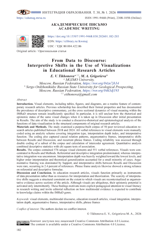 Введение. Визуальные элементы – неотъемлемая часть современных исследовательских статей. Предыдущие работы описывали их формальные свойства и фиксировали распространенность описательных комментариев, однако взаимосвязь динамики визуального значения в структуре IMRaD остается недостаточно четко определенной. В частности, остается невыясненным вопрос о том, как изменяется риторический и эпистемологический статус визуального материала при его первоначальном упоминании в «Результатах» и дальнейшей презентации в разделе «Обсуждение». Цель исследования – провести дискурсивно-риторический и эпистемологический анализ функций визуализации данных в структурных компонентах оригинальных исследовательских статей. Материалы и методы. В исследовании использовался специально созданный корпус из 50 рецензируемых статей по педагогическим исследованиям, опубликованных в период с 2018 по 2024 гг. Словесные ссылки на визуальные элементы кодировались вручную с использованием аналитической схемы, охватывающей тип интеграции, индекс глубины интерпретации и интерпретативную функцию. Дополнительное кодирование фиксировало причинно-следственные связи, аргументативные рамки, интерпретативные сдвиги между разделами «Результаты» и «Обсуждение», а также повторяющиеся речевые конструкции. Надежность разметки оценивалась посредством двойного кодирования подмножества корпуса и расчета межэкспертного согласия. Количественный анализ сочетал описательную статистику с критерием хи-квадрат для проверки ассоциаций. Результаты исследования. Выявлено 576 визуальных элементов и 551 вербальная отсылка. Большинство визуальных элементов содержится в разделах «Результаты» и «Методы». Среди типов интеграции преобладают референтные и описательные, в то время как интерпретативная интеграция встречается крайне редко. Глубина интерпретации остается недостаточной, уровни причинной интерпретации и теоретического обобщения в сумме составили около 10 % случаев. Аргументативные фреймы в основном сводятся к функции подтверждения, а интерпретативные сдвиги между результатами и обсуждением обнаружены только в 2,4 % случаев. Анализ фразеологических фреймов также показал преобладание референтных и описательных формулировок. Обсуждение и заключение. Визуальные материалы в педагогических статьях функционируют как инструменты представления данных. Недостаток интерпретационных сдвигов указывает на структурное ограничение степени реконтекстуализации визуальных материалов в качестве аргументативных доказательств в различных разделах статьи. Несмотря на повсеместное распространение визуальных материалов, их эпистемологический потенциал активируется лишь периодически. Эти выводы побуждают к более явному педагогическому вниманию к визуальной грамотности в научных статьях и предлагают редакторам задуматься о том, как мультимодальные доказательства должны способствовать утверждению знаний в рамках жанра IMRaD.