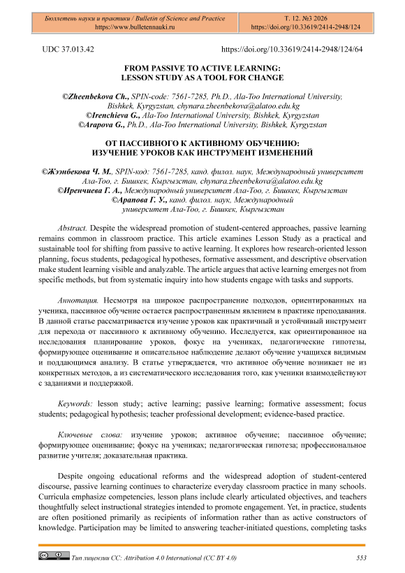 Несмотря на широкое распространение подходов, ориентированных на ученика, пассивное обучение остается распространенным явлением в практике преподавания. В данной статье рассматривается изучение уроков как практичный и устойчивый инструмент для перехода от пассивного к активному обучению. Исследуется, как ориентированное на исследования планирование уроков, фокус на учениках, педагогические гипотезы, формирующее оценивание и описательное наблюдение делают обучение учащихся видимым и поддающимся анализу. В статье утверждается, что активное обучение возникает не из конкретных методов, а из систематического исследования того, как ученики взаимодействуют с заданиями и поддержкой.