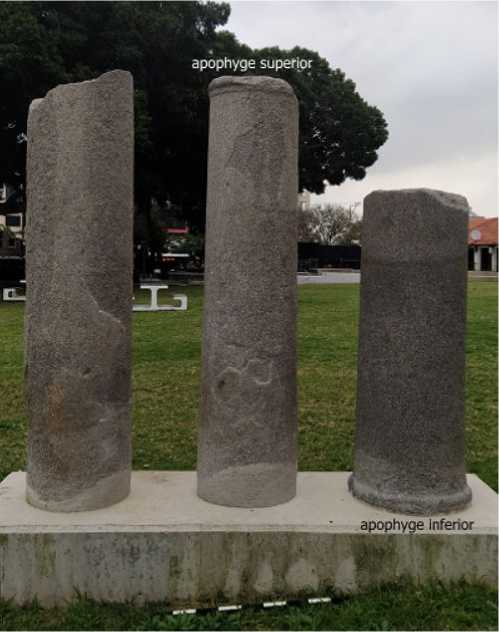 The three segments of monumental column shafts on display (nos. 5, 6, and 7, Fig. 13 ) were carved from Troad gray granite. The left segment comprises the middle part of the shaft, while the middle and right segments are the upper and the lower parts of the shaft, as indicated by their proportions and moldings ( entasis, apophyges superior and inferior, Fig. 12 ).
