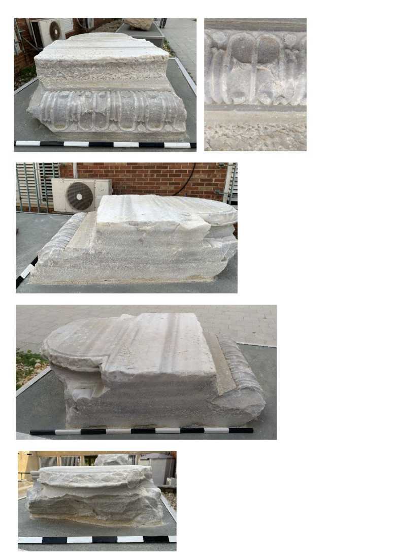 The architectural element on display was originally a Roman Attic semi-base, which was turned upside down. On its rear side, the fluted cornice (cyma reversa) with a hidden cross among the short flutes was carved (no. 11, Fig. 20). The round (moon-like) moldings (so-called cablings) within the flutes show their bottom part. Between the flutes are stands with gems instead of arisses (ribs). The fluted cornices are known from Hellenistic and Roman times in local and regional archi-tecture29; however, only Late Antique/Byzantine parallels will be mentioned here.