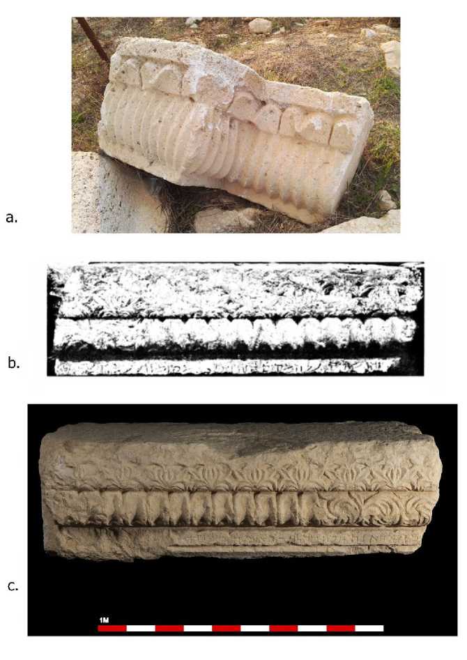 Fig. 21. a. Fluted capital and cornice in Burj Beitin. Photo of A. Zelikman. b. First segment of the fluted frieze from the synagogue in ‘Alma. From: Hachlili 2013, 475, Fig. X-1:b. c. Second segment of the fluted frieze from the synagogue in ‘Alma (IAA no. 1958-730). Photo: E. Ostrovsky. Courtesy of Israel Antiquities Authority.