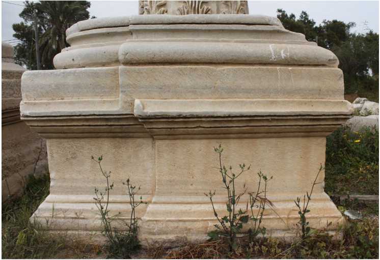 The original Roman Attic base, with a squared pedestal, was sawn and chiseled on three of its sides in the Byzantine period, preserving only the rounded torus and part of the cornice (no. 12, Fig. 22 (see also Fig. 19)). Similar complete pedestals were found near the Severan Basilica of Ashkelon and vicinity42 (Fig. 23). In the Early Byzantine period, the semi-pedestal of a smaller scale was carved on the bottom side of the pedestal under consideration (no. 12). It was decorated with a molded cornice, base, and a fluted dado between them. The cablings are showing the bottom part of the pedestal (it is presented in the upside-down position). Apparently, the pedestal was incorporated in the same edifice as the fluted cornice, presumably a church (item no. 11, Fig. 20). The style of the fluted pedestal is Byzantine, though the typologically close parallels among the local architecture are known only from the Crusader Church of Nativity in Bethlehem (Bagatti 2002, Pls. 2, 4).