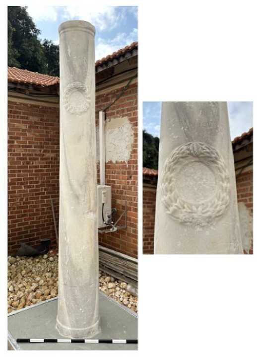 The complete marble column on display is carved in Classical and fine Roman style. It narrows toward the top ( entasis ) and features moldings at the top and bottom edges ( apophyges superior and inferior ). However, the column is safely dated to the Early Byzantine period, as it bears an indicative wreath with a defaced cross, with its traces still visible. As the decoration is in relief, it was carved together with the column, not during its secondary use. Such wreaths usually adorn chancelscreen panels in churches. The only other similar shaft, decorated with a relief wreath comprised of two laurel branches tied by Heracles's knot in the lower part, and with the relief cross within it, was described (though not illustrated) by