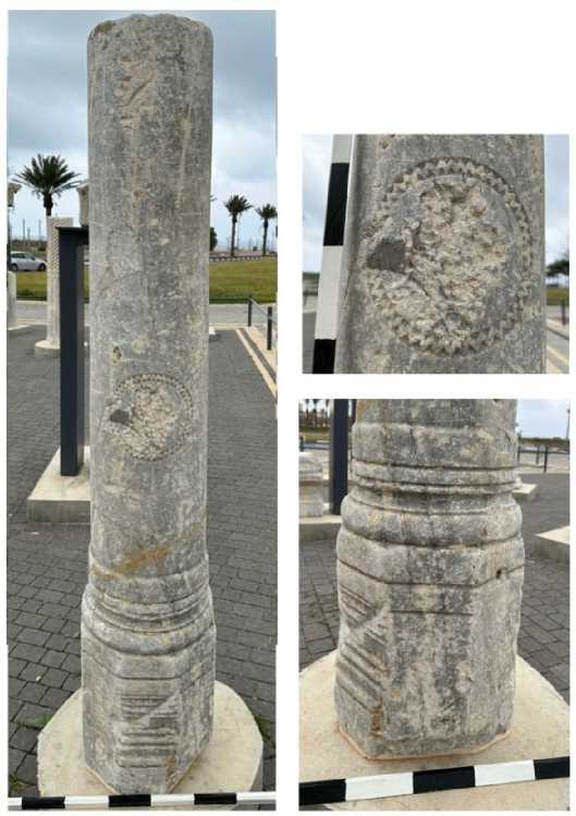 The first group consists of “purely” Roman details. These are four Corinthian capitals and three segments of granite column shafts (displayed outside of the courtyard), which originated in the basilica, odeum, streets, or forum of the city of Ashkelon.13