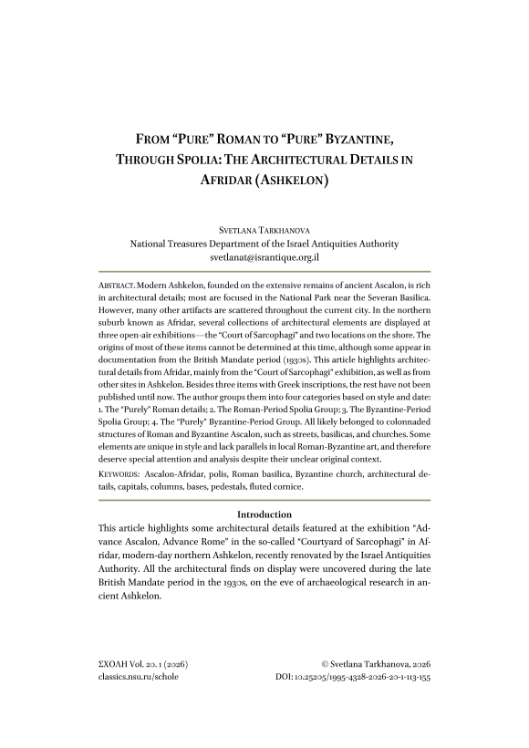 Текст научной статьи From “Pure” Roman to “Pure” Byzantine, Through Spolia: The Architectural Details in Afridar (Ashkelon)
