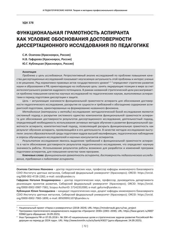 Функциональная грамотность аспиранта как условие обоснования достоверности диссертационного исследования по педагогике