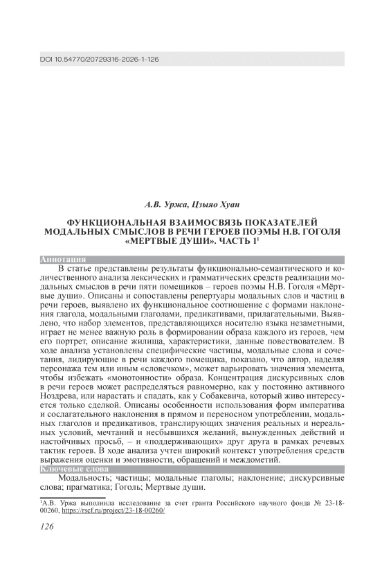 Функциональная взаимосвязь показателей модальных смыслов в речи героев поэмы Н.В. Гоголя «Мертвые души». Часть 1