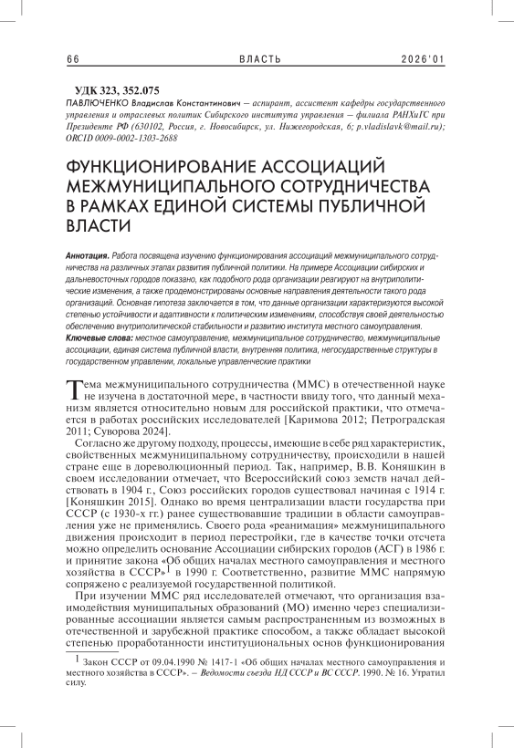 Местное самоуправление, межмуниципальное сотрудничество, межмуниципальные ассоциации, единая система публичной власти, внутренняя политика, негосударственные структуры в государственном управлении, локальные управленческие практики
