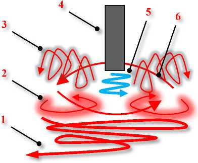 2 – melt flow along the reverse flow profile; 3 – zone of intense bubbling with swirling flows; 4 – tuyere; 5 – blast mixture; 6 – rotation of the melt bath in a horizontal plane